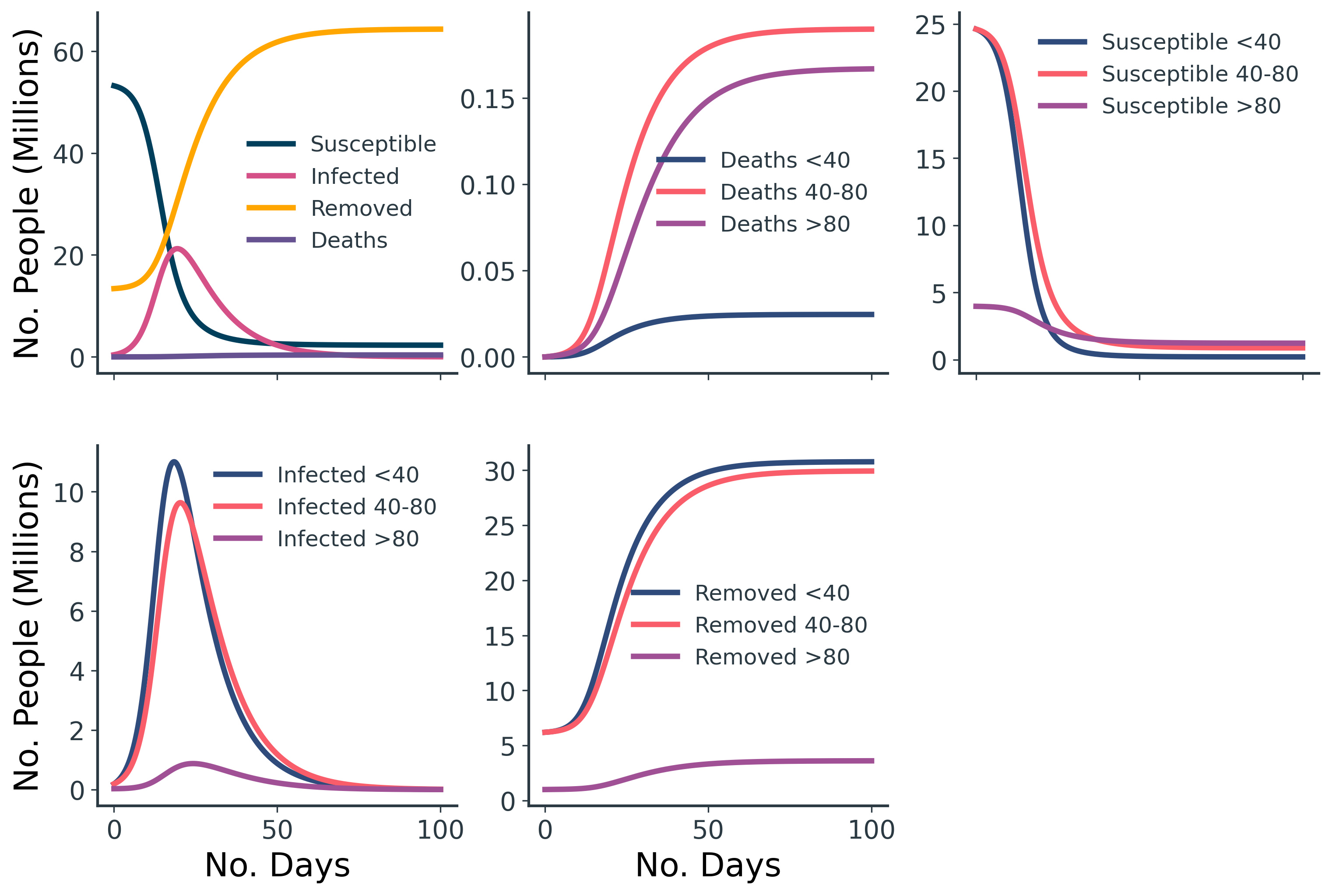 Armed with this simple model, we can repeat the UK simulation but with the population split across separate age groups. We approximate three age groups - <40, 40-80, >80 - each with starting populations of 31M, 31M, and 5M, respectively. We assume once again that 1/160 people are infected, 20% have already recovered from COVID-19, and that the recovery time from infection is 10 days (\( \gamma = 0.1 \)). It's difficult to find reliable data for mortality rates across these age groups, but based on gov.uk, it seems reasonable to approximate the mortality rate for >80 as eight times greater than for 40-80, which itself is eight times greater than <40. The values shown below (Table 2) produce an overall mortality rate of 0.77% which is comparable to our standard SIRD model above.