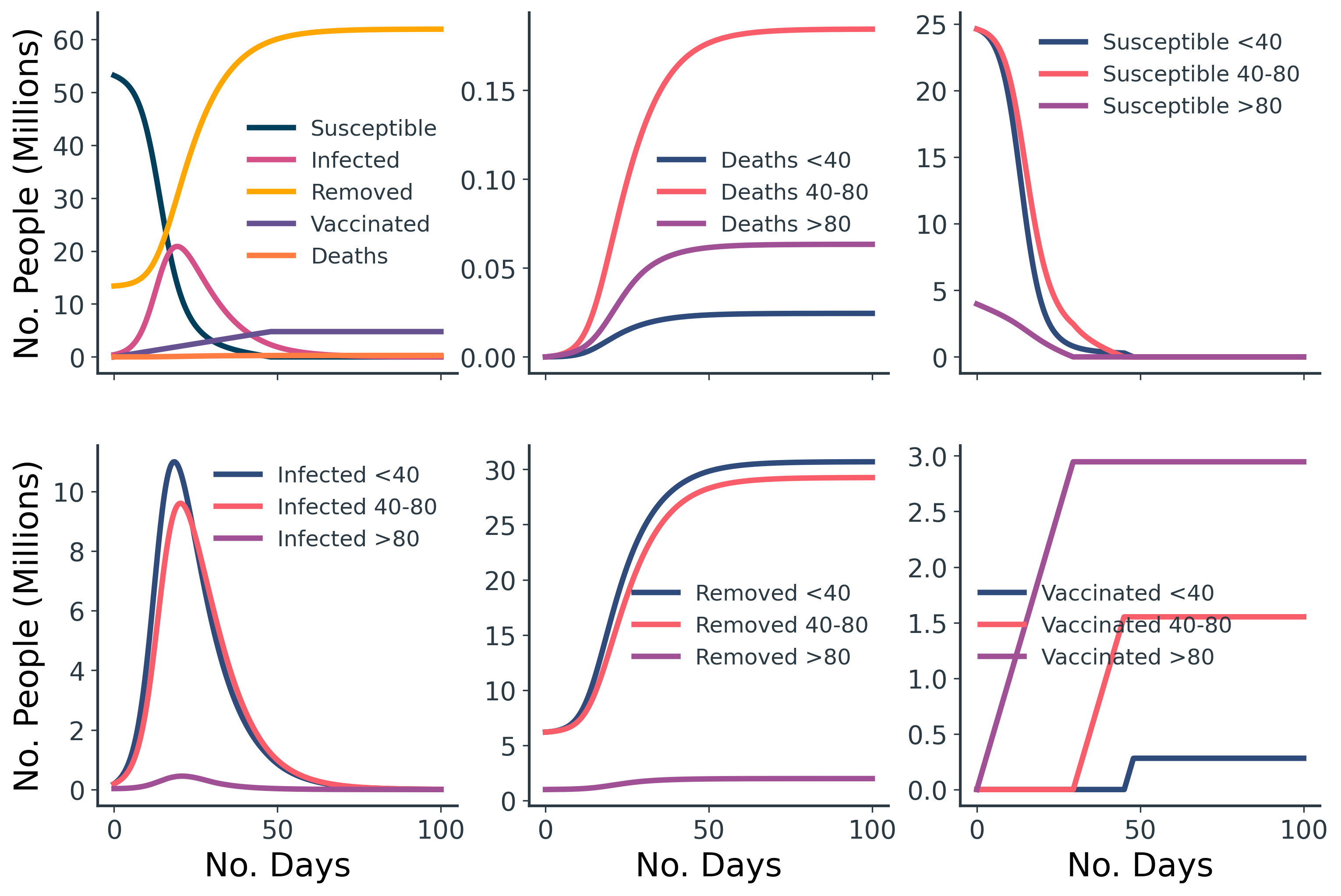 For a vaccination campaign that vaccinates 100k people per day, in the order of oldest-to-youngest age group, we get the results shown in Figure 7. Just before 50 days into the simulation, there are no more susceptible people available for vaccination.