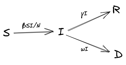 The number of people who move from a susceptible to an infected state is determined by the rate of infection, \( \beta \), multiplied by the number of susceptible people, \( S \), multiplied by the proportion of people they encounter that are infected, \( \frac{I}{N} \), where \( N \) is the number of living people, \( S + I + R \). More formally: \( S_{t+1} = S_{t} - \frac{\beta S_{t}I_{t}}{N_{t}} \) and \( I_{t+1} = I_{t} + \frac{\beta S_{t}I_{t}}{N_{t}} - \gamma I_{t} - \omega I_{t} \).
