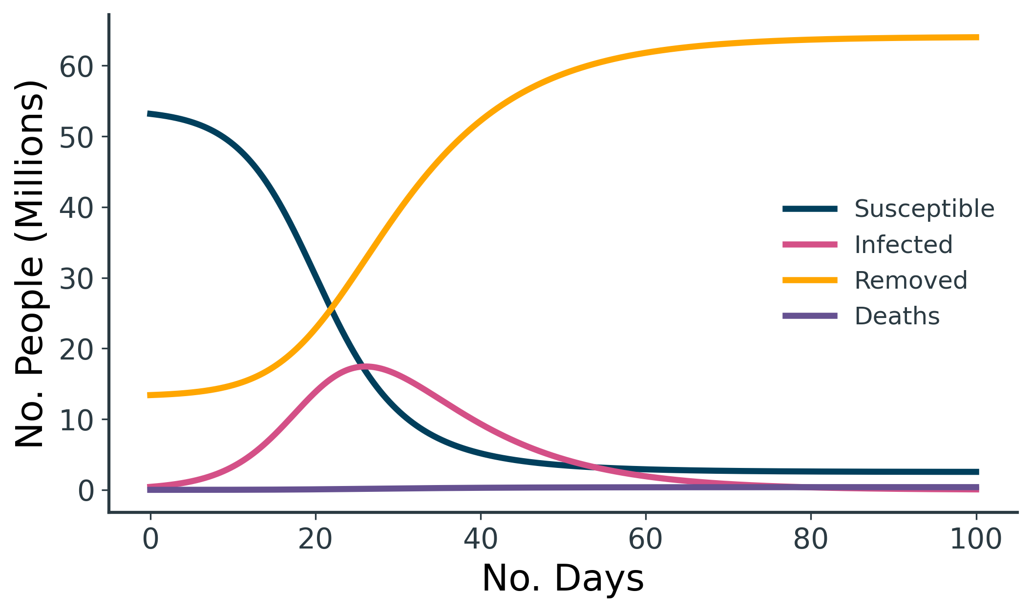 Table 1 shows the result of the above 100-day simulation, with 98.7% of the 53.2M starting susceptible population becoming infected, of whom 380k die.