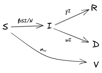 The final step is to incorporate a vaccination rollout into the model. This can be implemented by simply moving a fixed number of susceptible people, \( n_v \), to a vaccinated state, \( V \), at each timestep. Within a structured model, we can specify the order in which each group should be prioritised for vaccination.