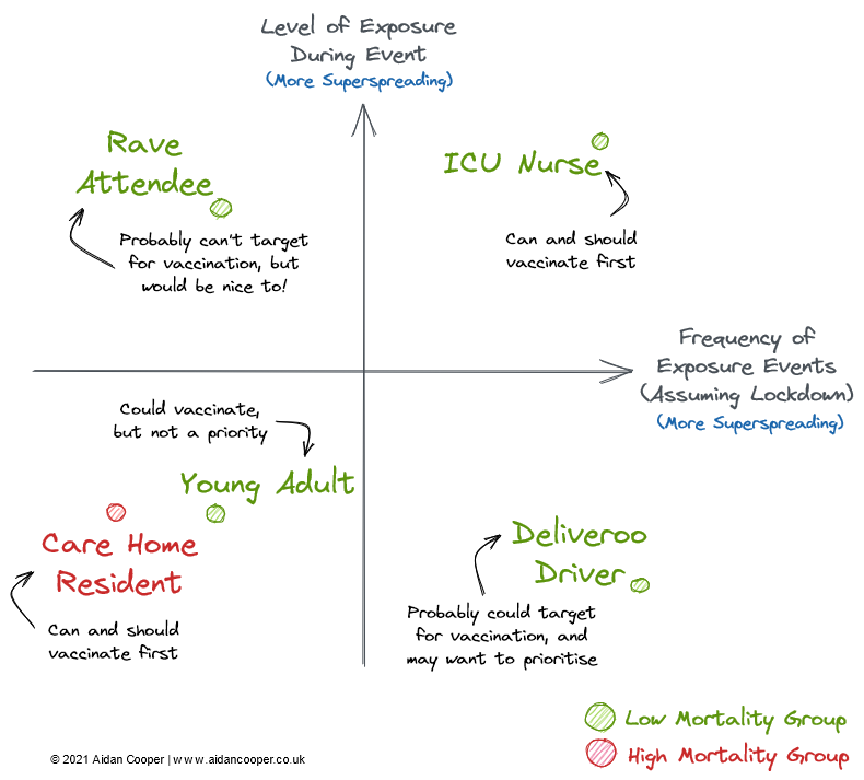 However, as we've established, these two dimensions alone are insufficient to devise a vaccination strategy. We must also consider mortality rates, as well as the practical and ethical implications of targetting vaccination towards these groups. Both of these factors are orthogonal to the frequency and risk of exposure events axes.