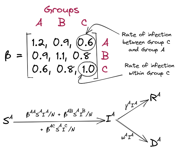 In its simplest form, a SIRD model assumes a homogenous population, but we can extend it to simulate a combination of sub-populations. We do so by having distinct S, I, R, D, compartments for each group (e.g. \( S = S^A + S^B + S^C \), \( I = I^A + I^B + I^C \) etc.) for which we specify their own rates of recovery and mortality (\( \gamma^A \), \( \gamma^B \), \( \gamma^C \), \( \omega^A \), \( \omega^B \), \( \omega^C \)). The rate of infection, \( \beta \), is only slightly more complex and can be specified as a matrix of infection rates within and between each group, as below (Figure 4).