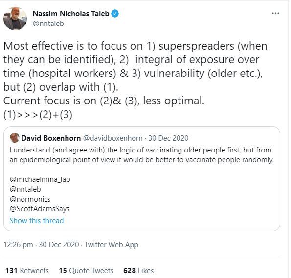 Of course, there are practical and ethical issues with this proposed vaccine rollout strategy. For one, how can you immediately identify this tiny group of virulent superspreaders? And even if you somehow could, would you be able to vaccinate them? What if they don't comply? One might suspect that "virulent superspreader" and "anti-vaxxer" are two sides of the same coin.