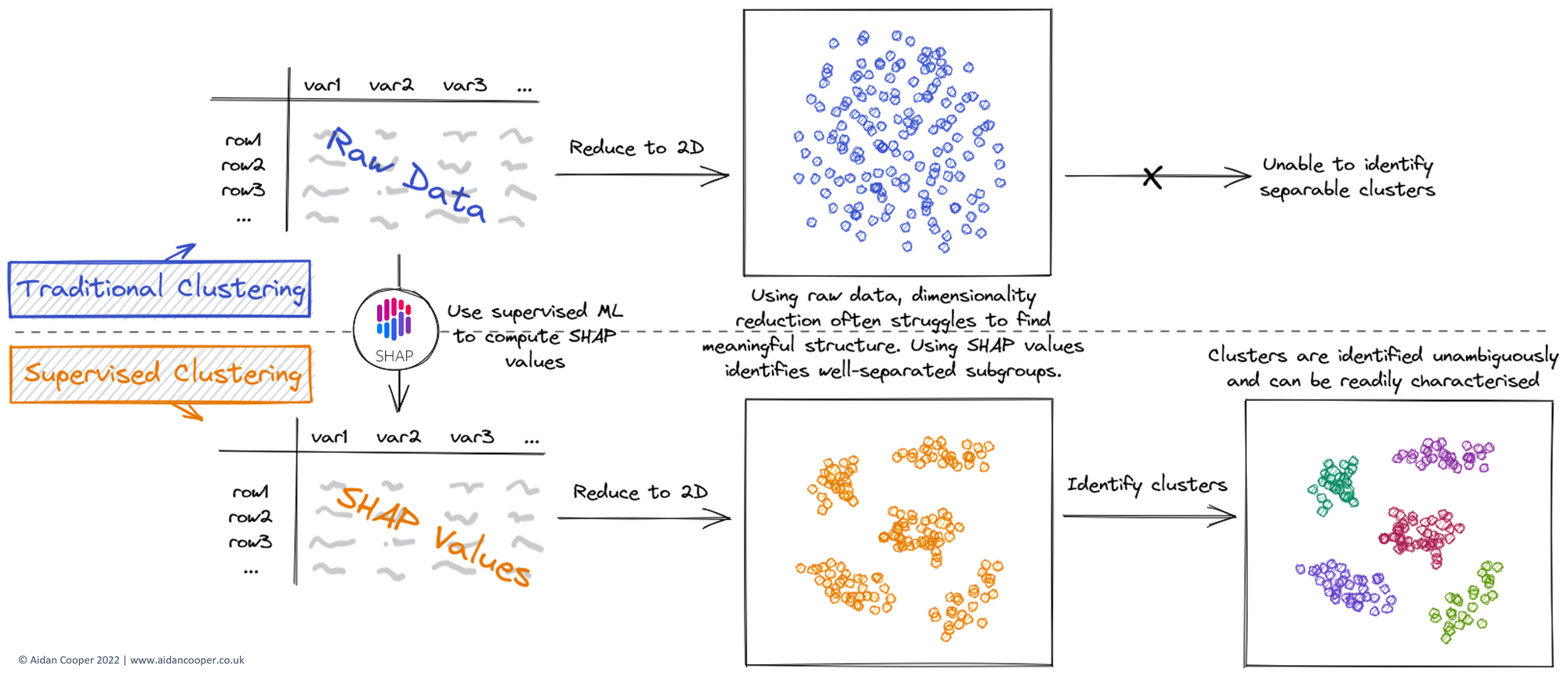 Cluster analysis is a popular method for identifying subgroups within a population, but the results are often challenging to interpret and action. Supervised clustering leverages SHAP values to identify better-separated clusters using a more structured representation of the data. This article demonstrates the benefits of supervised clustering with an example based on simulated data. I provide a simple illustration of a methodology I applied to COVID-19 symptom clustering for a paper at the ECML PKDD 2021 conference.